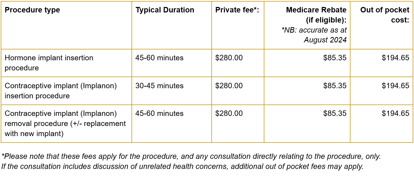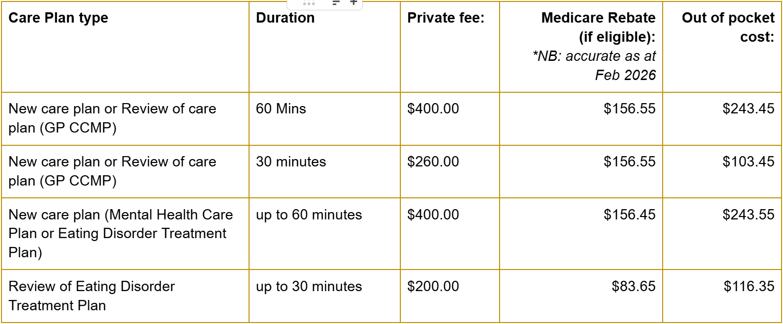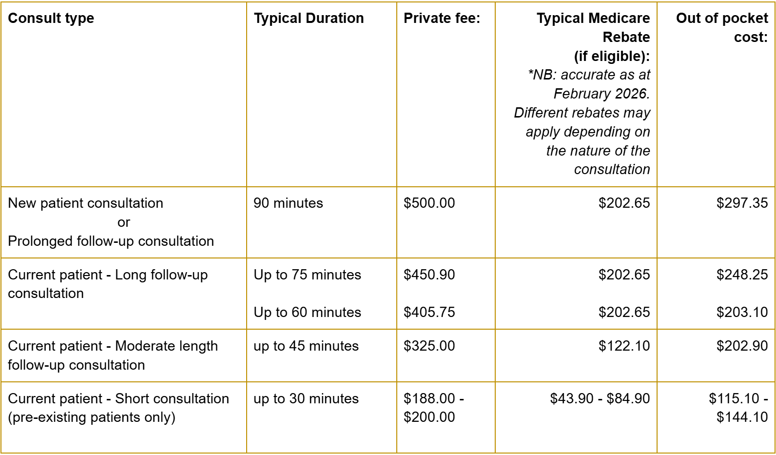 The tables below provide an overview of the typical fees for consultations with Dr Portia, as well as the expected Medicare rebate for these types of consultations. Please note that this is not an exhaustive list of the services that Dr Portia provides. If you have questions about Dr Portia’s fees or services, please contact her reception team at: